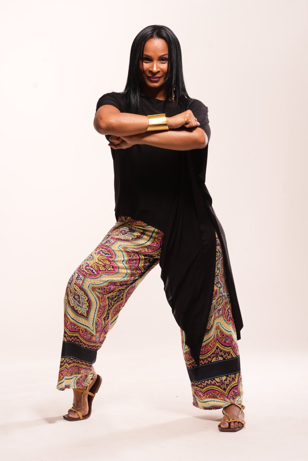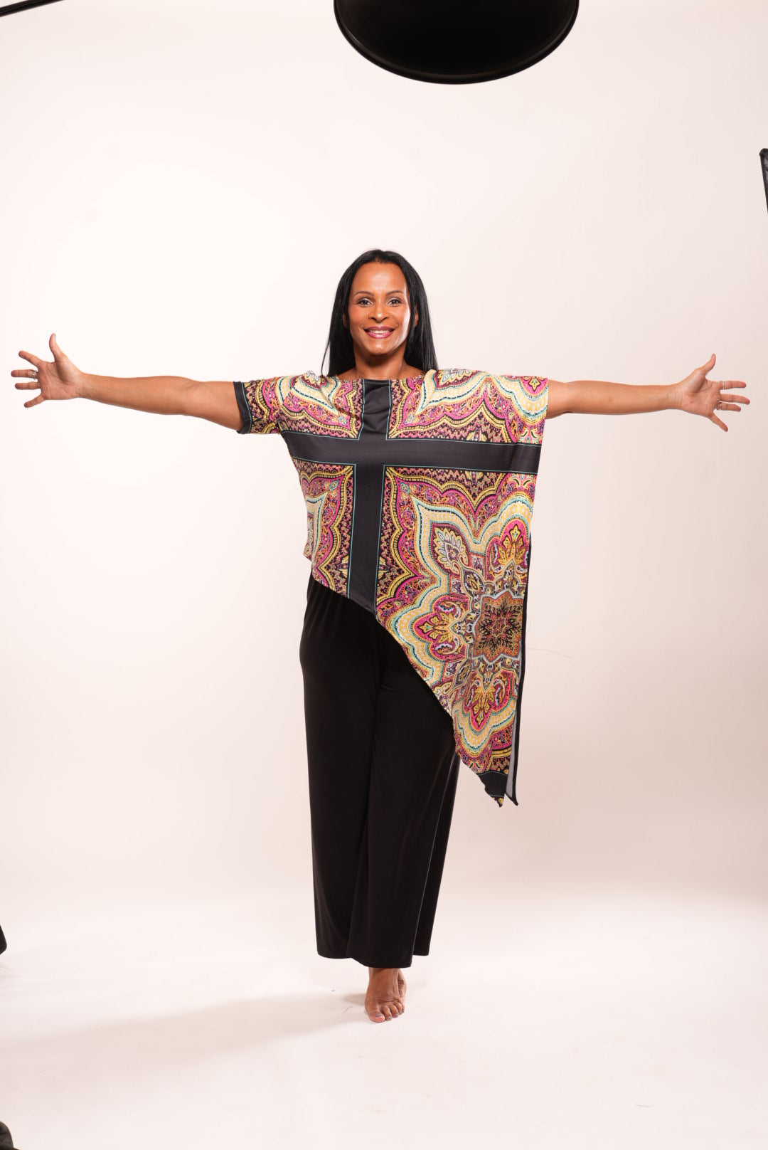 This handmade stretch top features a cross-over asymmetric cut in a paisley-inspired print. Crafted for ease, mobility, and comfort, it transitions seamlessly from Sunday service to casual gatherings, travel days, or a special evening out. Lightweight yet modest, it offers style with freedom of movement.