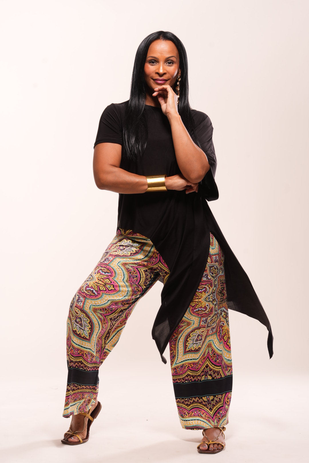 These handmade straight-leg pants in a paisley-inspired stretch fabric are designed with an elastic waistband for mobility and comfort. Their versatile cut makes them perfect for Sunday gatherings, travel days, or styled chic for a date night.