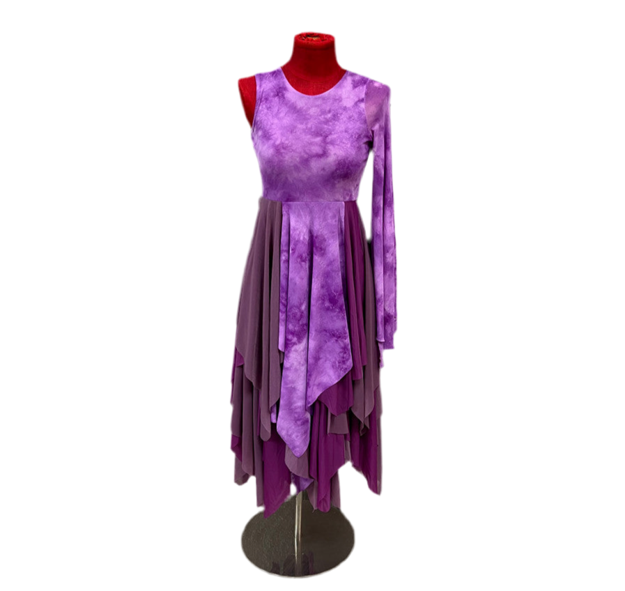 Step into grace and flow with this stunning asymmetrical dance dress, designed to inspire freedom and authority in every movement. Crafted from soft lycra with a delicate mesh overlay and a gorgeous purple tie-dye effect, this piece features a unique one-sleeve design and a layered skirt with plenty of fabric for an elegant, flowing look.